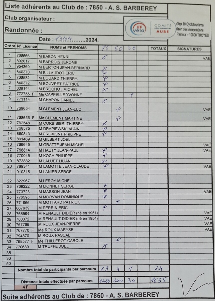 20 clubs étaient représentés et l’AS Barberey termine à la 3ème place (derrière le VCS et le VC Bréviandes) avec 24 cyclos présents (19 sur le 75km, 4 sur le 50 et 1 sur le 30) ce qui lui permet de remporter une bouteille de champagne.