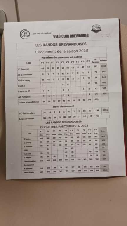 Mercredi soir, le VC Breviandes recevait les clubs ayant participé aux randonnées Breviandoises. Les organisateurs se sont félicités de la participation record à ces brevrets permanents en remarquant toutefois le declin des grands circuits. La très grande majorité des cyclos a privilégié les parcours n'excédant pas 100 km... Conséquence probable du vieillissement du peloton. Avec 84 parcours effectués, notre club se classe 3ème et a reçu un magnum en récompense. Merci à nos adhérents qui ont participé à ces brevets et fixons nous l'objectif de faire mieux en 2024.