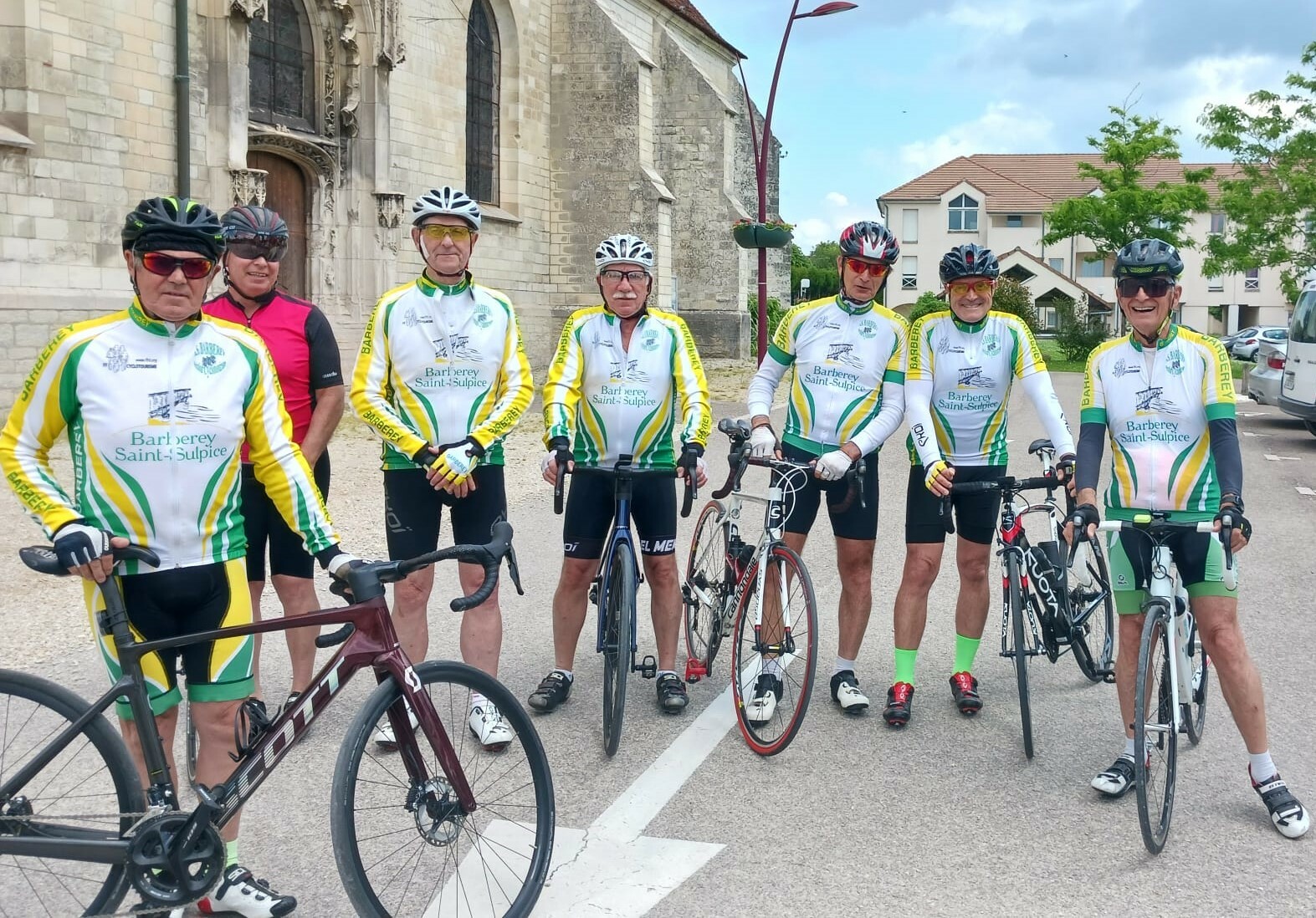 Neuf cyclos au départ de la place de l'église de St Parres aux Tertres, sous un ciel nuageux.